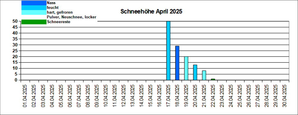 Kein Diagramm bedeutet, dass in dem Monat kein Schnee gefallen ist. Bei nur 1 Tag wird nur dieser Tag angegeben.
